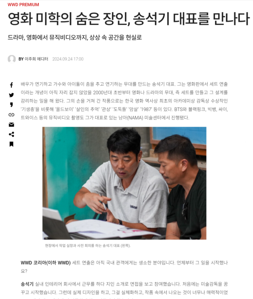 배우가 연기하고 가수와 아이돌이 춤을 추고 연기하는 무대를 만드는 송석기 대표. 그는 영화판에서 세트 연출이라는 개념이 아직 자리 잡지 않았을 2000년대 초반부터 영화나 드라마의 무대, 즉 세트를 만들고 그 설계를 감리하는 일을 해 왔다. 그의 손을 거쳐 간 작품으로는 한국 영화 역사상 최초의 아카데미상 감독상 수상작인 ‘기생충’을 비롯해 ‘올드보이’ ‘살인의 추억’ ‘관상’ ‘도둑들’ ‘암살’ ‘1987’ 등이 있다. BTS와 블랙핑크, 빅뱅, 싸이, 트와이스 등의 뮤직비디오 촬영도 그가 대표로 있는 남아(NAMA) 미술센터에서 진행됐다.