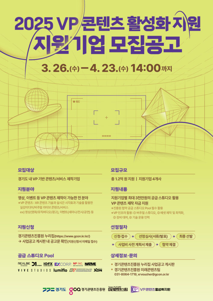 경기콘텐츠진흥원에서 버추얼 프로덕션(VP) 기반 공급 스튜디오를 활용한 VP 콘텐츠/서비스 제작을 지원하는 [VP 콘텐츠 활성화 지원] 사업의 지원기업을 모집하오니 많은 관심과 참여를 바랍니다.