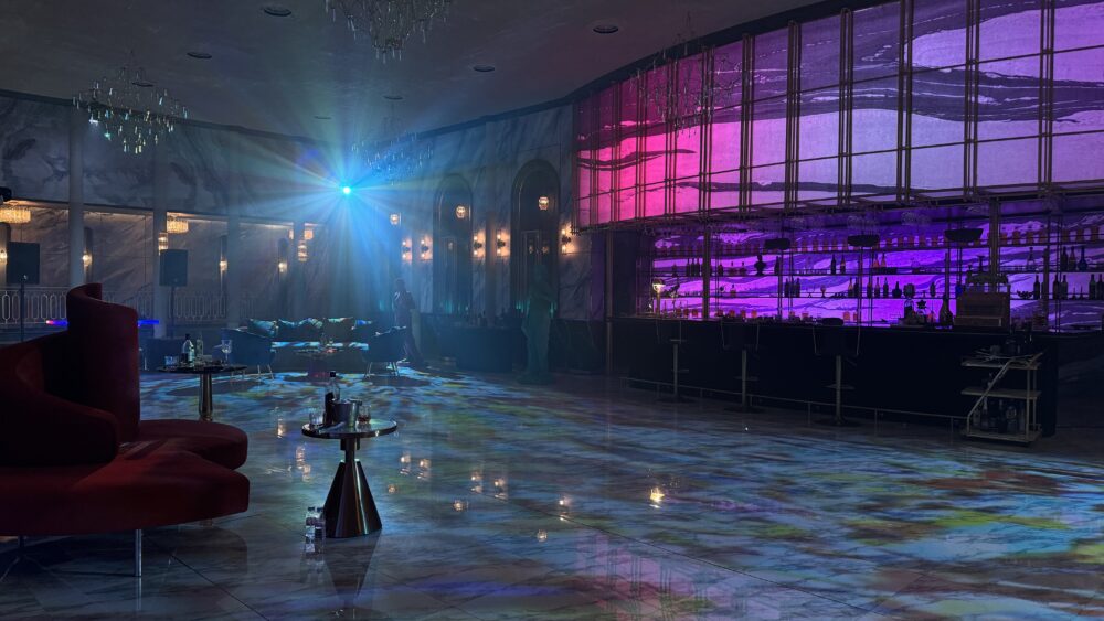 Native used two 16,000 ANSI projectors to create the visual effects for the club scene. On-site, they built and operated a variable platform that could be electrically adjusted to adjust the projector’s position and angle according to the camera angle. The video sources were based on those provided by media artists.